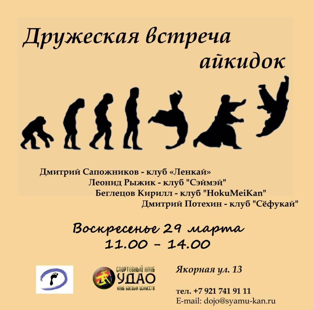 Весна в нашем городе бывает разной — и холодной, как январь, и жаркой, как август, но одно неизменно — очередная «Дружеская встреча» с друзьями на татами обязательно состоится!Встреча со старыми друзьями, встреча с незнакомыми пока еще людьми, общение в дружеской, свободной и веселой (обязательно!) компании, неизменно собирающейся на наши мероприятия.Место — Санкт-Петербург, ул. Якорная 13, клуб боевых искусств «УДАО». Время — воскресенье, 29 марта, 11.00 — 14.00.Мы рады гостям вне зависимости от практикуемого вами направления Айкидо. Мы рады гостям, практикующим другие боевые искусства. Мы никого не учим — у каждого из нас свои Учителя и Сиханы. Мы приходим поучиться друг у друга, обменяться опытом, узнать что-то новое и просто получить удовольствие от трехчасовой интенсивной тренировки.Участие — бесплатно.